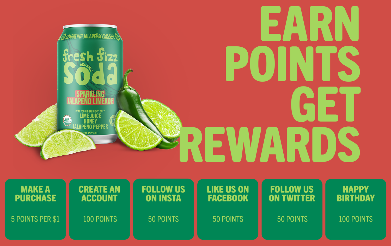 Create an account and earn 100 points. 1,000 points earns you a free case of Fresh Fizz Soda.